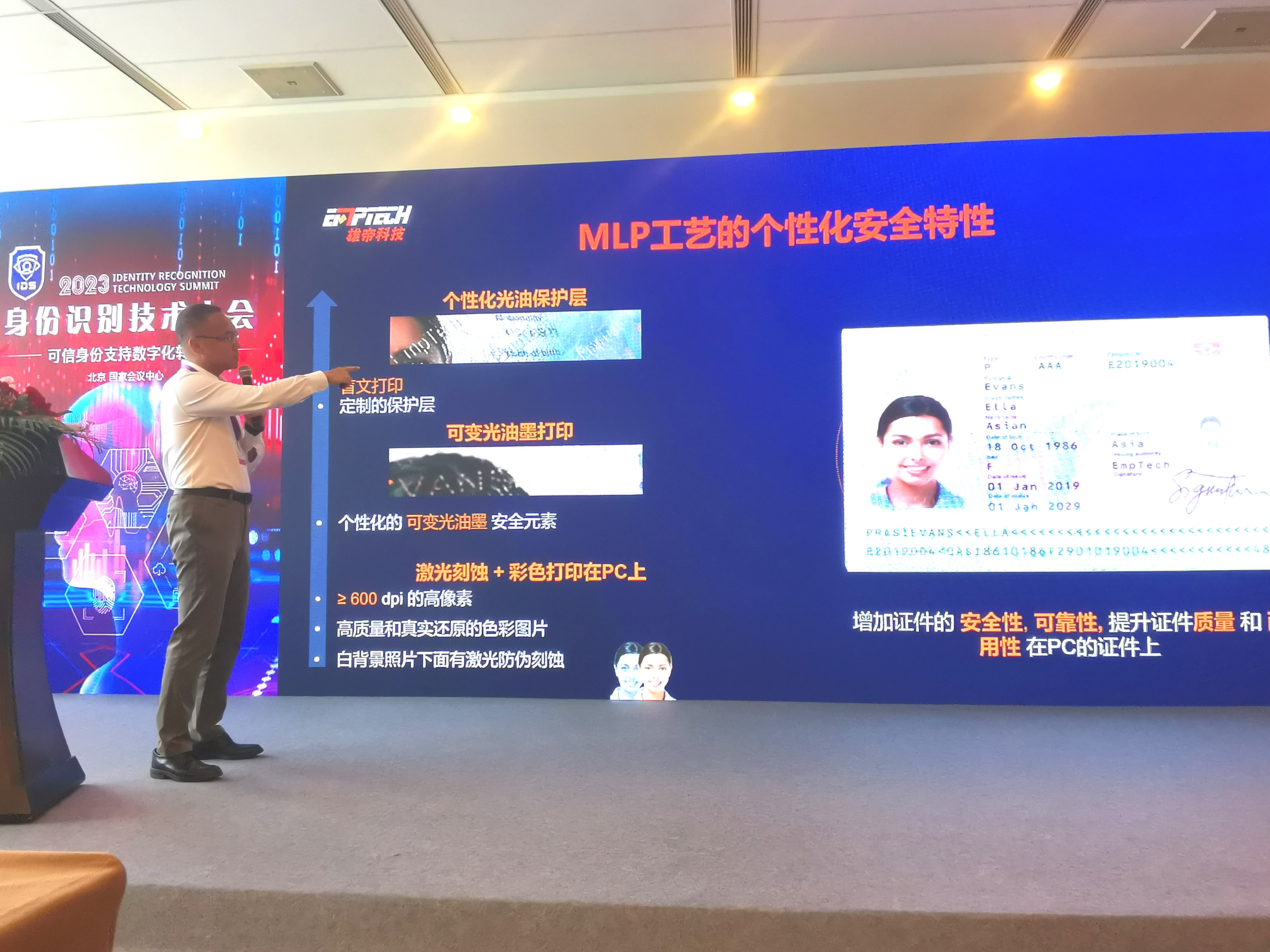 雄帝科技受邀參加2023身份識(shí)別技術(shù)大會(huì)(IDS),總裁鄭嵩先生受邀在大會(huì)期間的安全證件發(fā)展論壇,發(fā)表題為《國(guó)際旅行證件技術(shù)應(yīng)用探討》的主題演講。會(huì)上,鄭嵩先生向參會(huì)嘉賓介紹了雄帝科技獨(dú)創(chuàng)的MLP多重個(gè)性化防偽工藝及先進(jìn)的工藝制發(fā)設(shè)備,這是雄帝科技自主研發(fā)的、具備突破性的彩色PC打印技術(shù)以及更強(qiáng)大的安全防偽打印技術(shù),并且已經(jīng)在多個(gè)國(guó)家案例應(yīng)用,全球累計(jì)發(fā)行近億張PC材質(zhì)的安全證件。此外,鄭嵩先生還向與會(huì)嘉賓展示了雄帝科技對(duì)身份辨識(shí)AI+應(yīng)用的探索。雄帝科技在高效率通行場(chǎng)景(地鐵、公交、高鐵、機(jī)場(chǎng)等)以及高安全驗(yàn)證場(chǎng)景(邊檢、智慧大廳、電子車(chē)牌、國(guó)際機(jī)場(chǎng)等),通過(guò)AI+身份識(shí)別技術(shù)延伸,實(shí)現(xiàn)高安全快速身份核驗(yàn)。