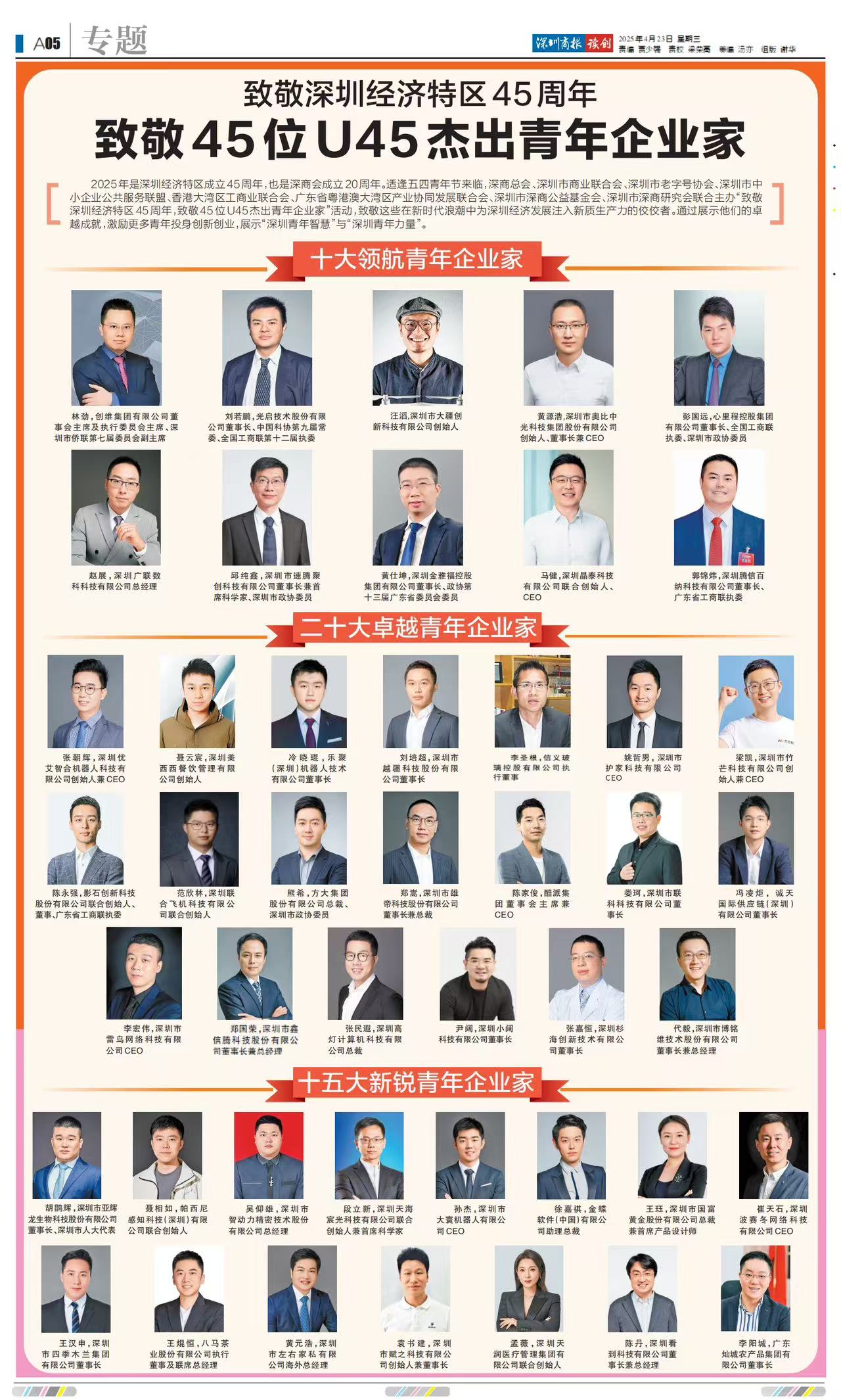 適逢五四青年節,由深商總會、深圳市商業聯合會、深圳市老字號協會、香港大灣區工商業聯合會等多家權威機構聯合主辦的“致敬45位U45杰出青年企業家”活動隆重舉行。該活動旨在表彰在新時代浪潮中為深圳經濟發展注入新質生產力的青年領袖,展示“深圳青年智慧”與“深圳青年力量”。