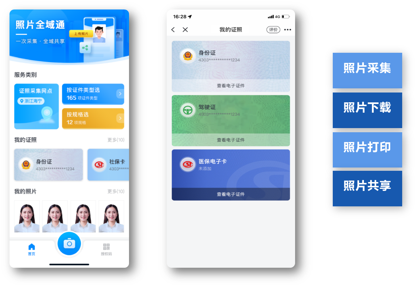 群眾可通過服務網點自助拍照設備采集照片,還可通過自己的手機在“浙里辦”、支付寶搜索“照片全域通”,完成證件照的自拍、上傳。